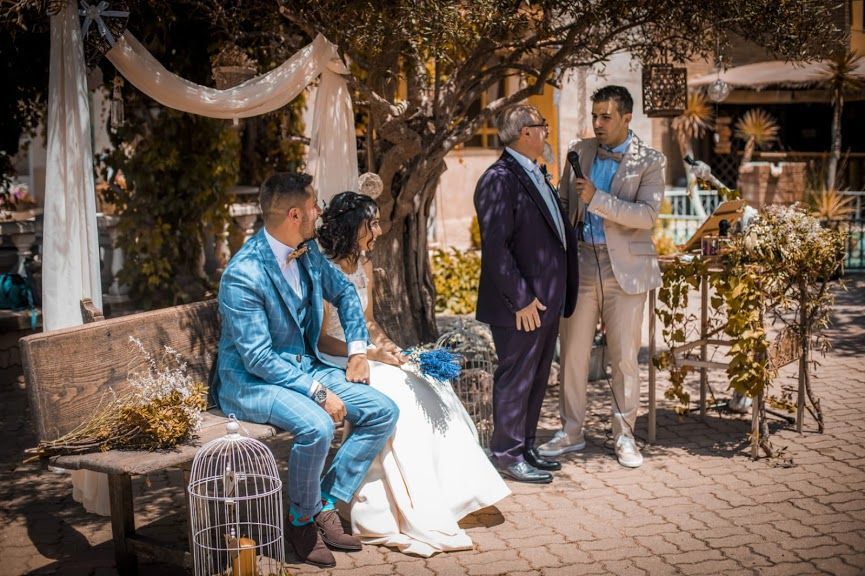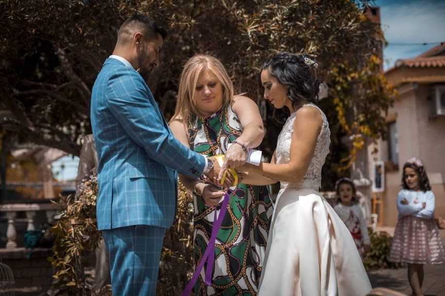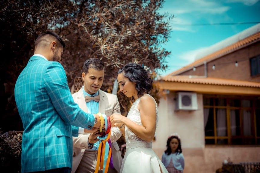 Los novios, con sus manos entrelazadas, formaban el símbolo del infinito. Un amigo que ofició la boda fue quien ató la última cinta que juntaba a todas. Aunque la última la colocó una amiga muy especial. Tan especial como lo era la cinta. Ya que, fue la misma con la que Henar le pidió a Ignacio matrimonio.